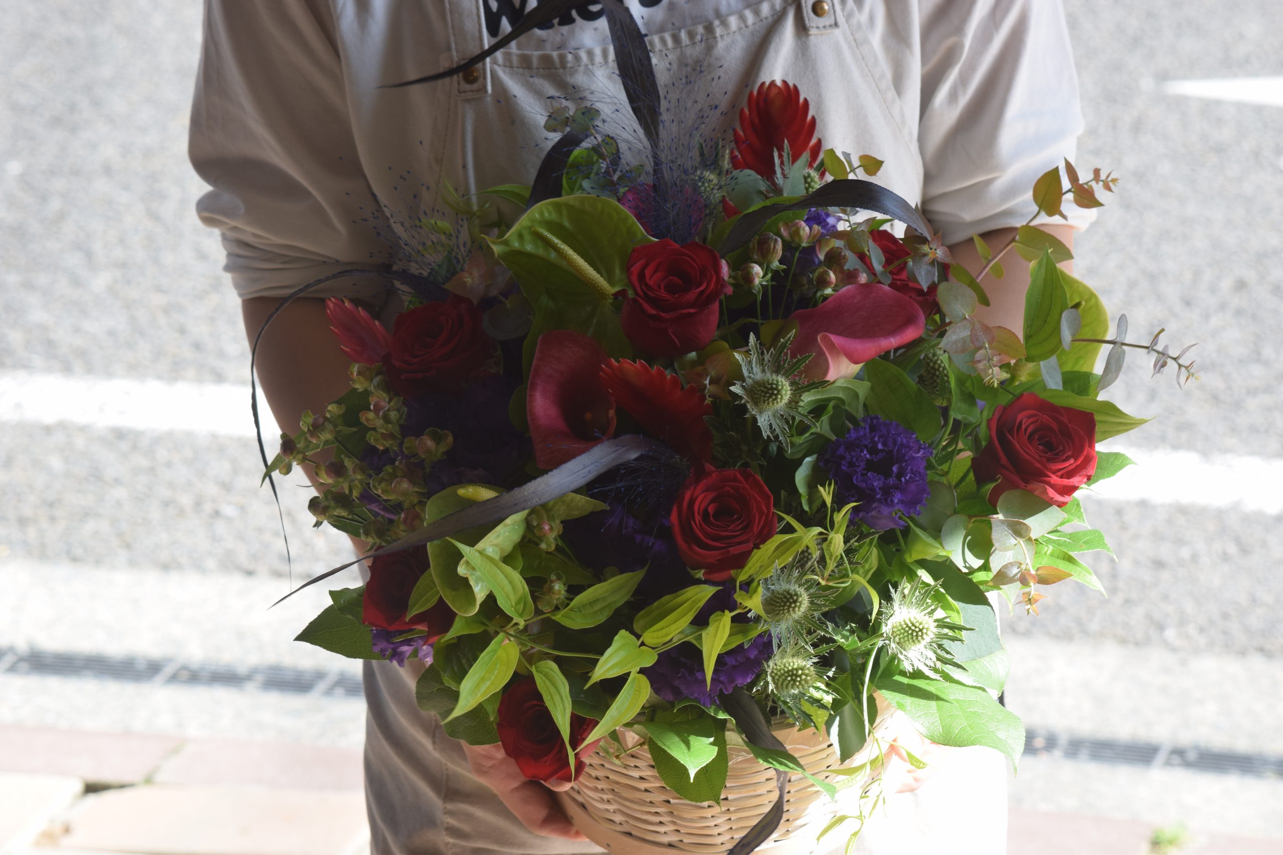 赤バラを入れてグリーンを織り交ぜつつ制作いたしました。